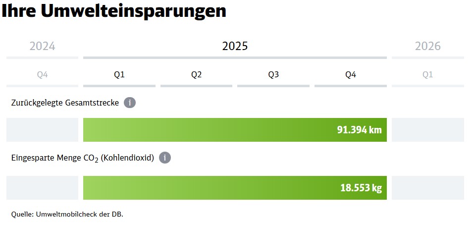 Wann immer es möglich ist, nutzen wir die Bahn für Dienstreisen und tragen so einen kleinen weiteren Teil zum Klimaschutz bei. Die Deutsche Bahn ermittelt regelmäßig die von unseren Mitarbeiter*innen gefahrenen Kilometer und die so eingesparten Schadstoffausstöße.
